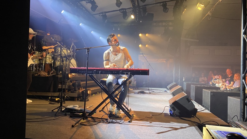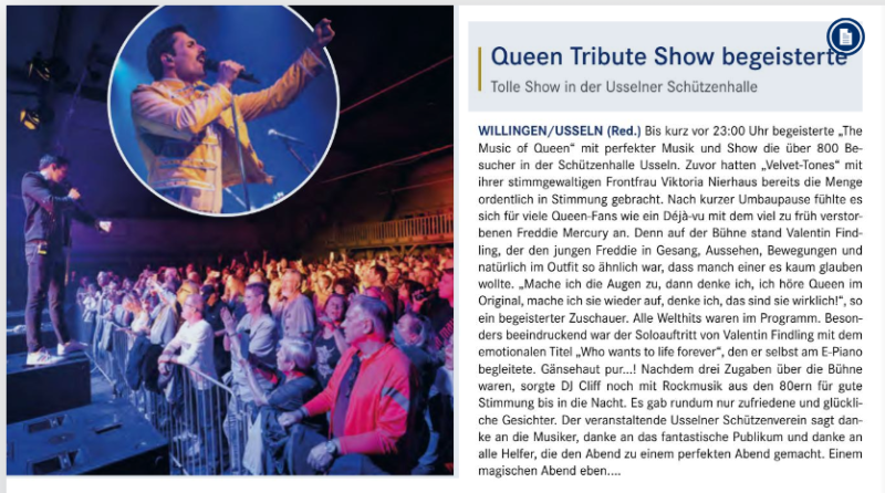 Bis kurz vor 23 Uhr begeisterte "The Music of Queen" mit perfekter Musik und Show die über 800 Besucher in der Schützenhalle. Zuvor hatten "Velvet-Tones" mit ihrer stimmgewaltigen Frontfrau Viktoria Nierhaus bereits die Menge ordentlich in Stimmung gebracht. Nach kurzer Umbaupause fühlte es sich für viele Queen-Fans wie ein Déjà-vu mit dem viel zu früh verstorbenen Freddie Mercury an. Denn auf der Bühne stand Valentin Findling, der den jungen Freddie in Gesang, Aussehen, Bewegungen und natürlich im Outfit so ähnlich war, dass manch einer es kaum glauben wollte. "Mache ich die Augen zu, dann denke ich ich höre Queen im Original, mache ich sie wieder auf, denke ich das sind sie wirklich!" so ein begeisterter Zuschauer. Alle Welthits waren im Programm. Besonders beeindruckend: der Soloauftritt von Valentin Findling mit dem emotionalen Titel "Who wants to life forever", den er selbst am E-Piano begleitete. Gänsehaut pur...!