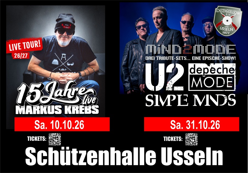 Am Samstag 10. Oktober gastiert Markus Krebs mit seiner neuen Tour "Das Beste aus 15 Jahren Markus Krebs" in der Schützenhalle, drei Wochen später kommen dann "Mind2Mode" mit einer 3 1/2 -stündigen Show mit den Welthits von Simple Minds, U2 und Depeche Mode in die Schützenhalle (Sa. 31.10.26). Die TiIckets für beide Highlights sind bereits erhältlich: